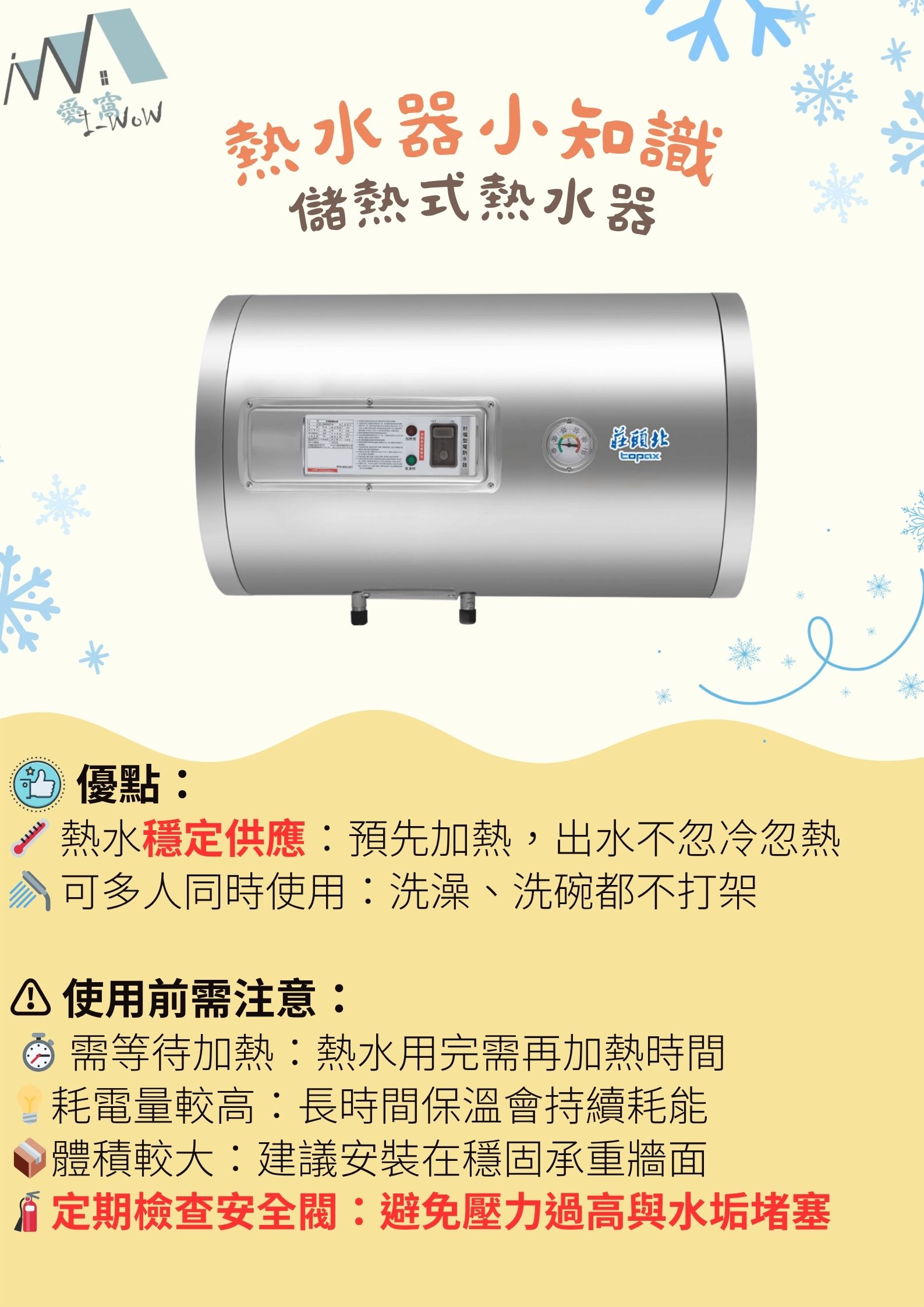 🔸 儲熱式熱水器(電熱型):先將水加熱後儲存,適合固定時段使用熱水。