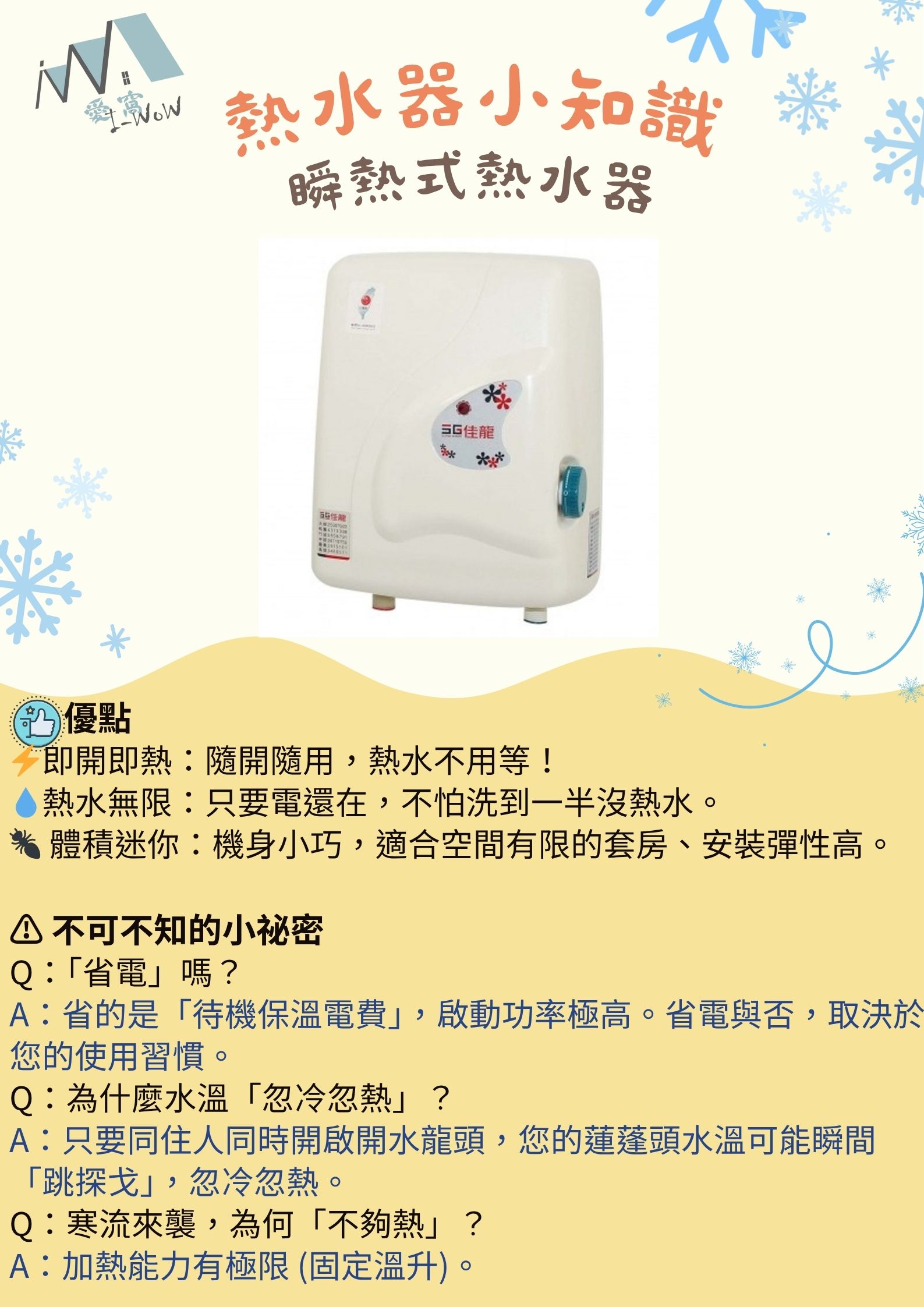 🔸 瞬熱式熱水器:邊加熱邊出水,節省空間。